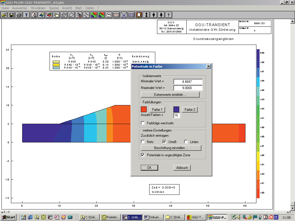 - Zeitorientierte Darstellung von Potentialen, Sickergeschwindigkeiten und Gradienten in beliebig definierbaren Schnitten