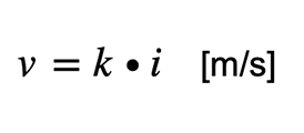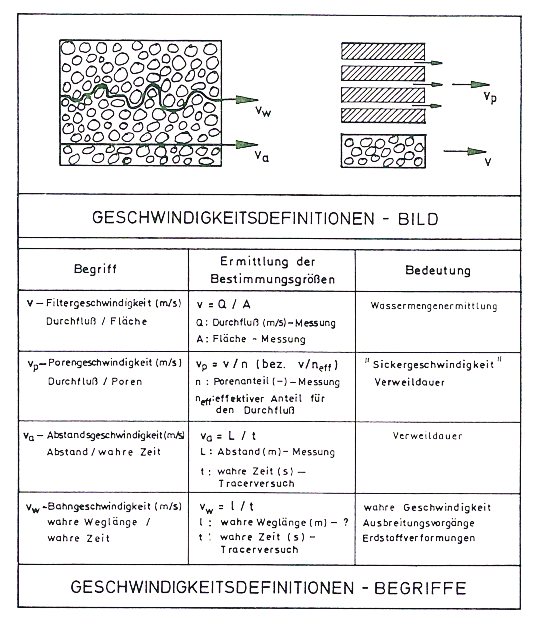Die Geschwindigkeit des Wassers wird nun definiert als Durchflussmenge in der Zeiteinheit, bezogen auf die Einheit der auf den Strömungslinien senkrechten gesamten Querschnittsflächen. Dieser Wert, die sogenannte Filtergeschwindigkeit, ist nicht die tatsächliche Geschwindigkeit der Wasserteilchen, da die Durchflussfläche aufgrund des Vorhandenseins von Bodenteilchen nur einen Teil der gesamten Querschnittsfläche ausmacht. Weitere Geschwindigkeitsdefinitionen finden sich in der folgenden Abbildung:
