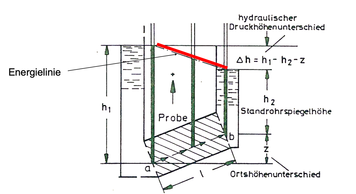 Bei der Durchströmung des Bodens wird der Potentialunterschied abgebaut, d.h. es wird Energie umgewandelt. Dies lässt sich mit Hilfe einer Energielinie darstellen.
