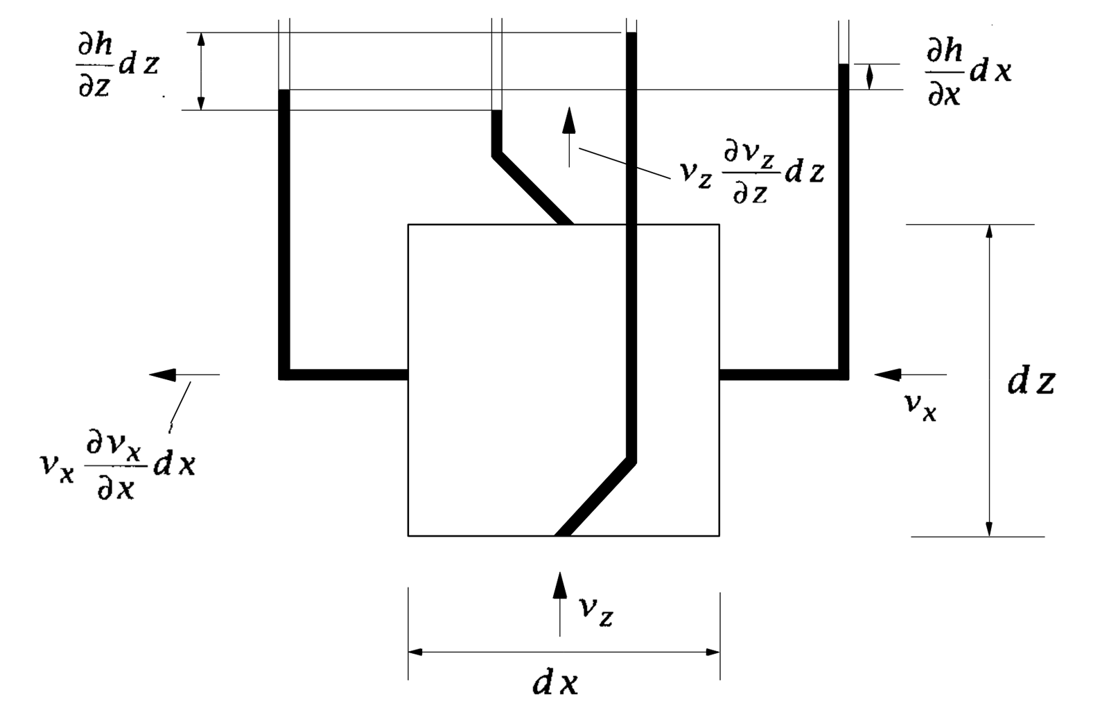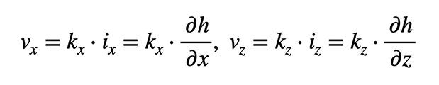 Die waagerechte Komponente der Strömungsgeschwindigkeit ist vₓ, der hydraulische Gradient in waagerechter Richtung iₓ. h ist die hydraulische Druckhöhe am Element. Die entsprechenden Werte in der vertikalen Richtung z sind vz und iz. Die Strömung ist zweidimensional. In der Richtung y ist der Gradient und daher auch die Wassergeschwindigkeit Null.