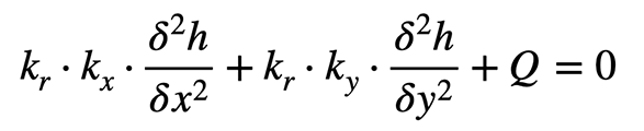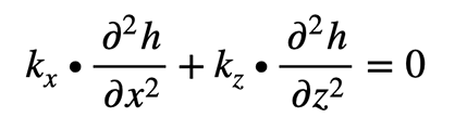Eingesetzt in die Kontinuitätsgleichung führt dies zur Laplace’schen Strömungsgleichung, die besagt, dass bei gleichbleibendem Rauminhalt eine Veränderung des Gradienten in Richtung z durch eine Veränderung mit entgegengesetztem Vorzeichen in der Richtung x ausgeglichen werden muss. Für isotrope Durchlässigkeitsverhältnisse mit kx = kz gilt somit: