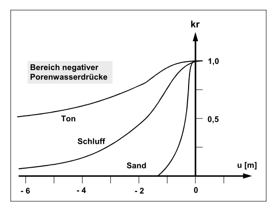 Der Wert kr erfasst die Veränderung der Durchlässigkeit in der ungesättigten Zone r oberhalb des Grundwasserspiegels und kann zwischen 0.0 und 1.0 liegen. In gesättigten Systembereichen ist kr gleich 1.0. Der Wert kr ist eine Funktion des Porenwasserdrucks u. Der Porenwasserdruck u berechnet sich aus der Standrohrspiegelhöhe h, der Ortshöhe y und der Wichte des Wassers γw .