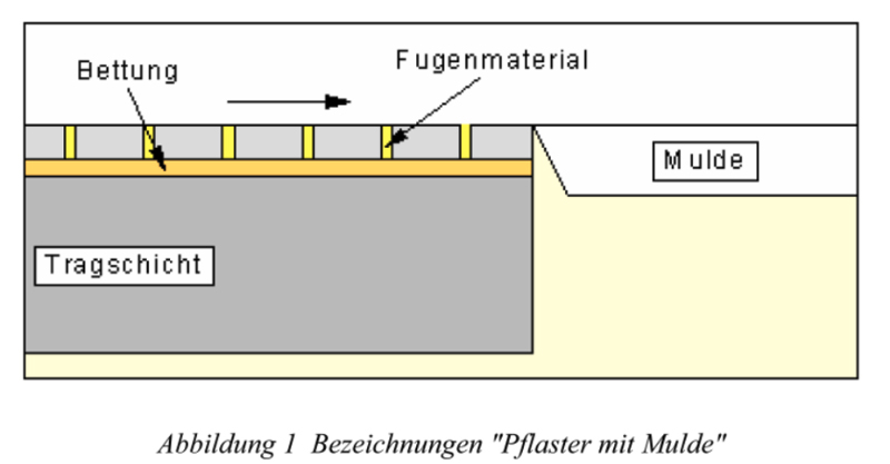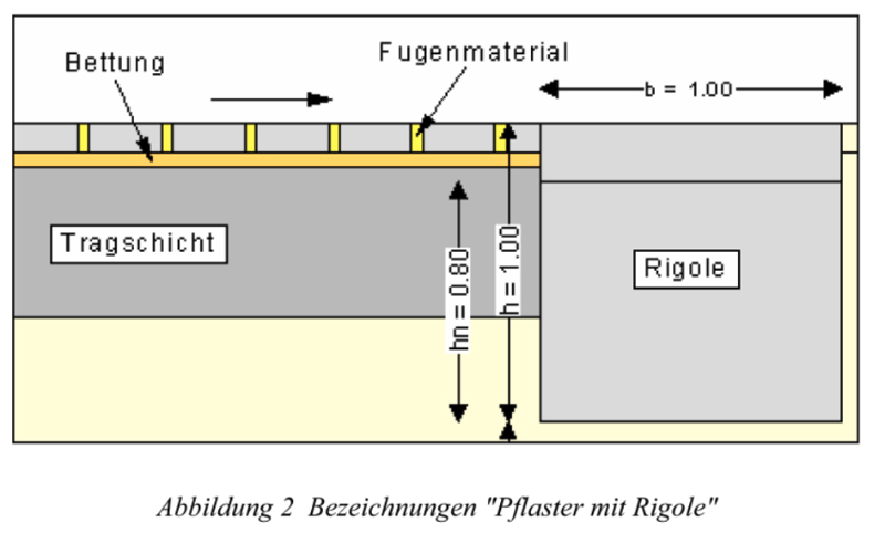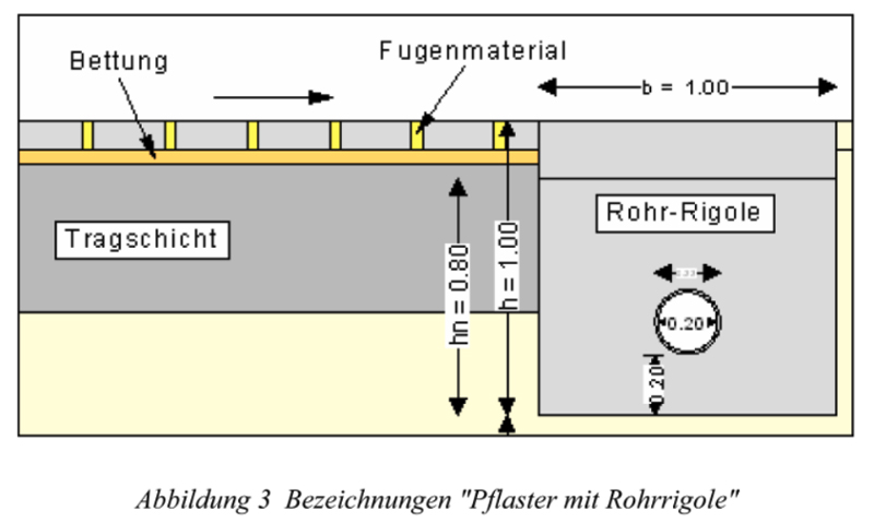 Weitere Versickerungsanlagen als Kombination von Pflaster mit Mulden-, Rigolen- bzw. Roh-Rigolen werden im Folgenden dargestellt, wobei Hinweise zur konstruktiven Ausbildung entsprechender Systeme dem Merkblatt für wasserdurchlässige Befestigungen von Verkehrsflächen, Forschungsgesellschaft für Straßen- und Verkehrswesen, Ausgabe 1998 zu entnehmen sind: